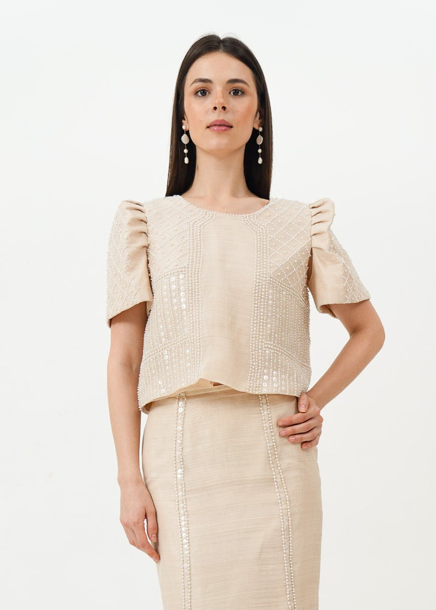 Weaved Puff Sleeved Top with Flared Piña Pants